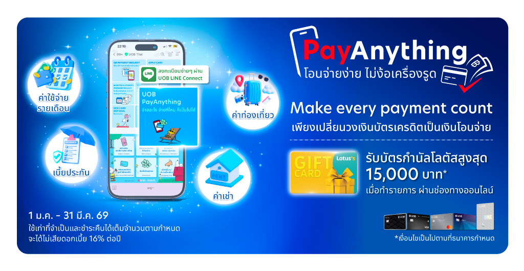 - This promotion is exclusively for primary UOB credit card holders (“Member”), except corporate credit card, who enroll UOB PayAnything transaction via online channels including UOB LINE Connect and the UOB website only, and have UOB PayAnything transaction during 1 January – 31 March 2026.The transaction date is based on the date shown in the bank's system (Transaction Date).