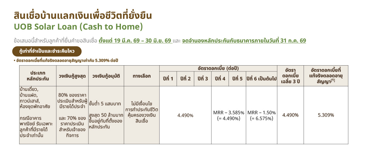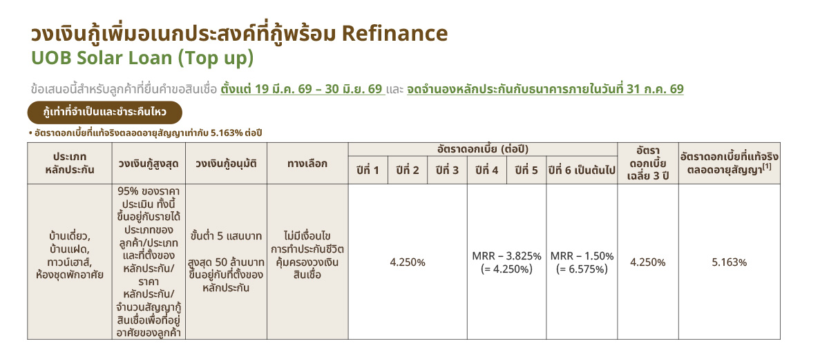 [1]อ่านรายละเอียด สินเชื่อบ้านรีไฟแนนซ์+กู้เพิ่มอเนกประสงค์ UOB Solar Loan (Refinance + Top up) เพิ่มเติมคลิก